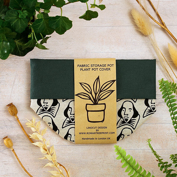 Hand-sewn fabric pot, hand-printed with a quirky portrait of Shakespeare in repeat.