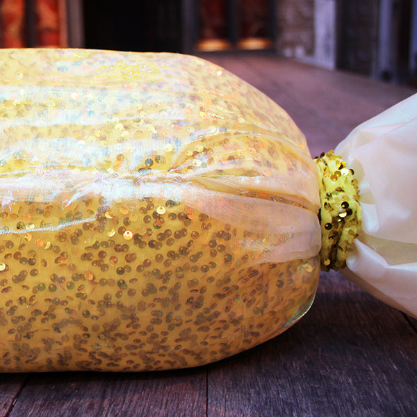 This one-of-a-kind sweet was made onsite at the Globe by our props team. It is made from foam over a wire aperture covered in a yellow fabric with gold sequins and a translucent cream fabric with gold sequin trim.