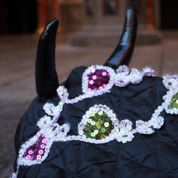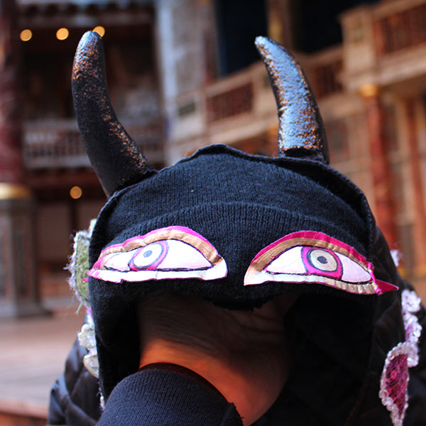 Witch hat made of painted foam and quilted fabric on a beanie hat. The hat is based on a black beanie hat with a quilted headscarf attached. The scarf is made of black fabric with pink, green and white decoration. The hat has painted leather eyes and black foam horns. The mask is from our 2024 production of Hansel & Gretel on the Globe stage.