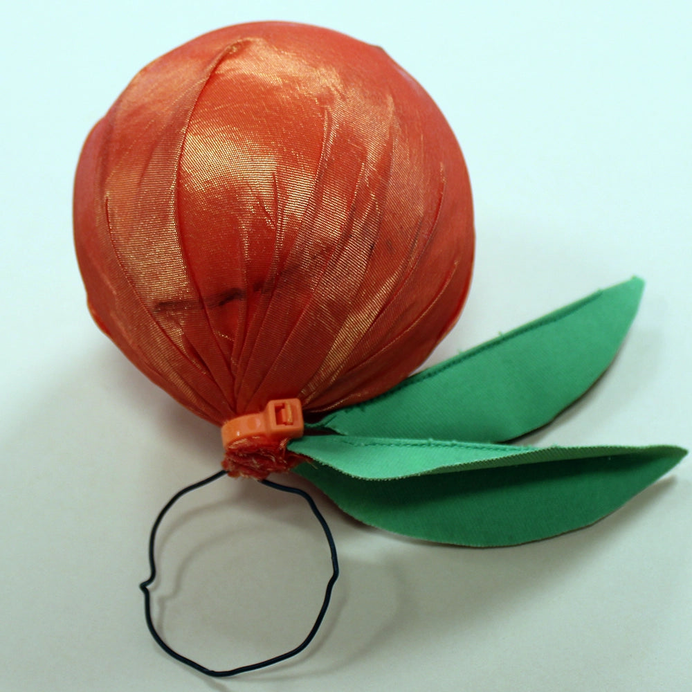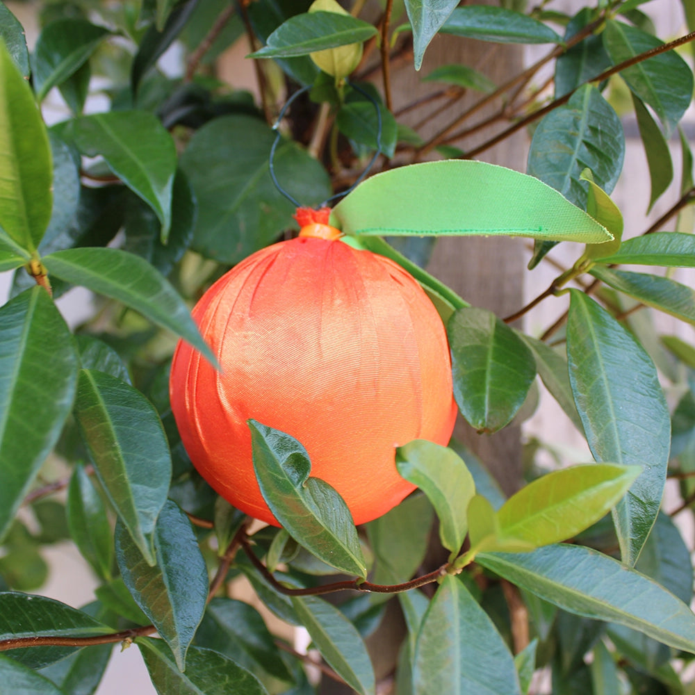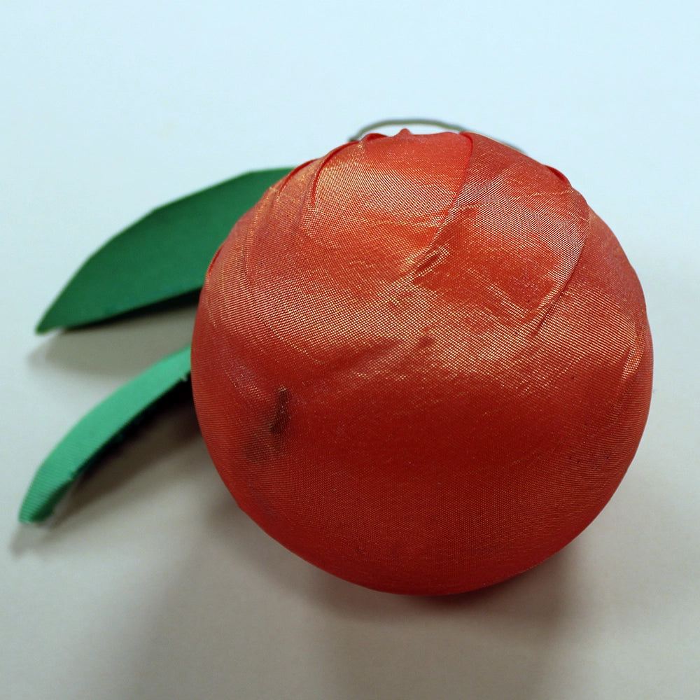 Each orange is handmade and may differ slightly from the images shown. Oranges are wrapped fabric around lightweight ball, secured at the top by an orange zip tie and include two sewn green leaves and a wire ring for hanging.