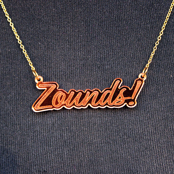Orange etched acrylic necklace set on a 20 inch (508mm) gold-plated chain with the Shakespearean exclamation Zounds! The necklace is presented in a recyclable Kraft card gift box.
