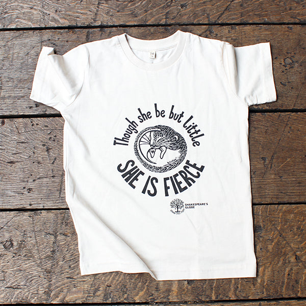 Our exclusive children’s t-shirts are designed by us and inspired by Shakespeare and his works. These cotton t-shirts feature bold graphics and are soft on the skin, making them perfect for wearing all year long. Featuring cartoon depictions of the Globe and William Shakespeare himself, or playful quotes from Shakespeare’s many works, these t-shirts are for the budding thespian and playwright alike.