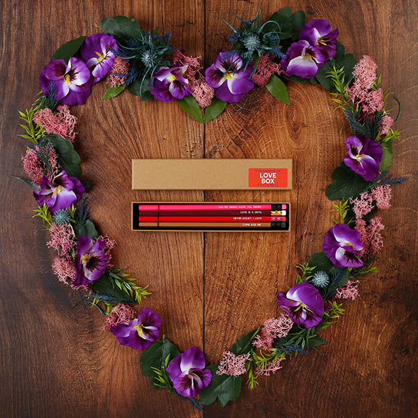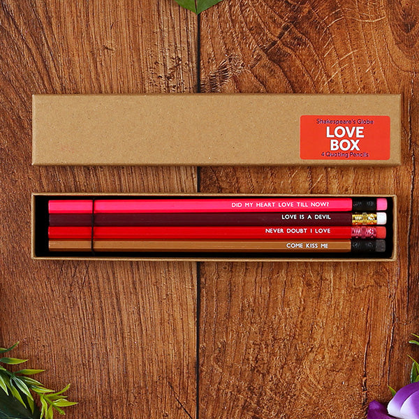 Kraft card box containing four quality wooden pencils, each hand-stamped with a different lovely Shakespearean quote.