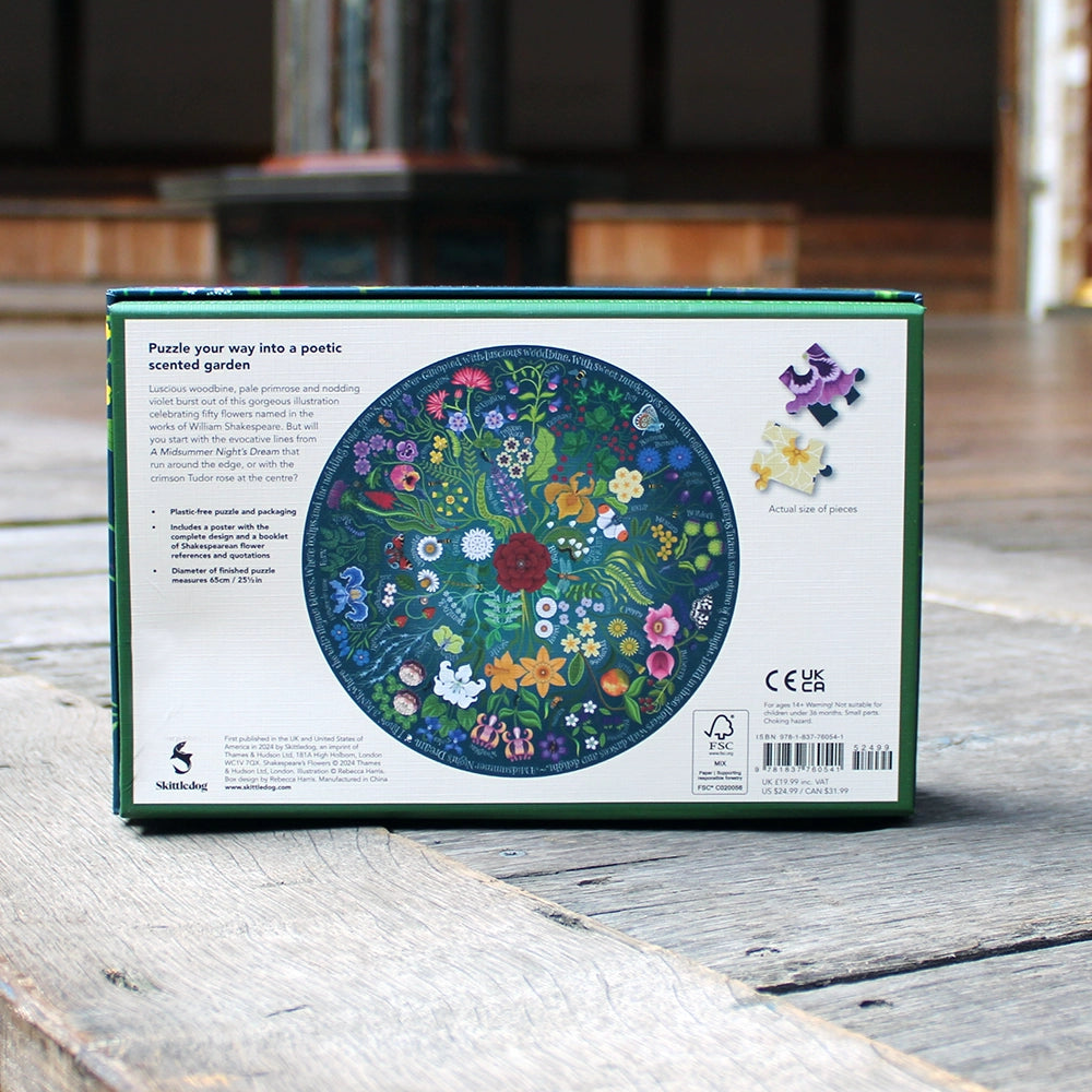 Roses, lilies, violets, and marigolds are among the 50 flowers, all featured in the works of Shakespeare, that wind around this beautifully literary circular jigsaw puzzle.