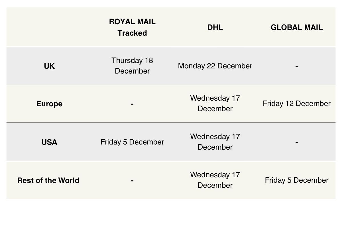 To have the best chance of receiving your order in time for Christmas, we recommend placing your order before our advised dates. Please note that delivery times are not guaranteed, so the earlier you order, the better.