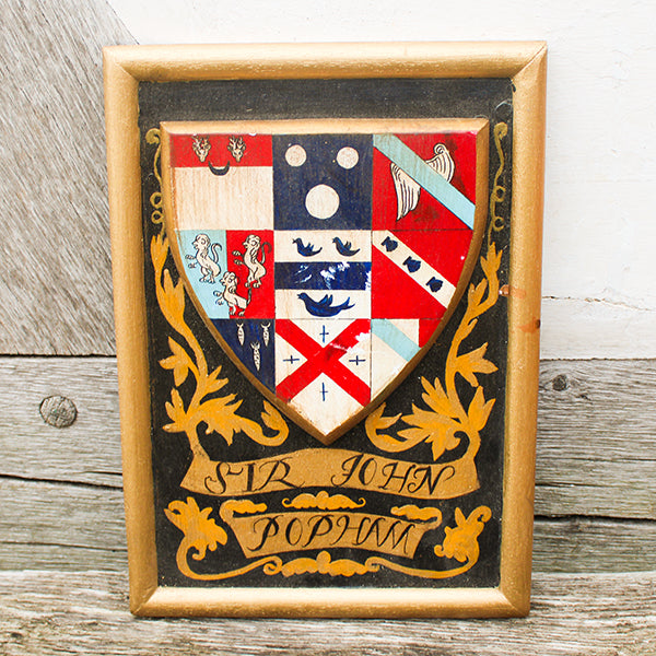 The coat of arms is made of wood and has a raised frame and raised shield in the centre. It has been hand-painted and made to look aged by our scenic painters. We have 10 of these small panels and this one is the coat of arms of Sir John Popham. Sir John Popham (1531 – 1607) of Somerset, was Speaker of the House of Commons (1580 to 1583).